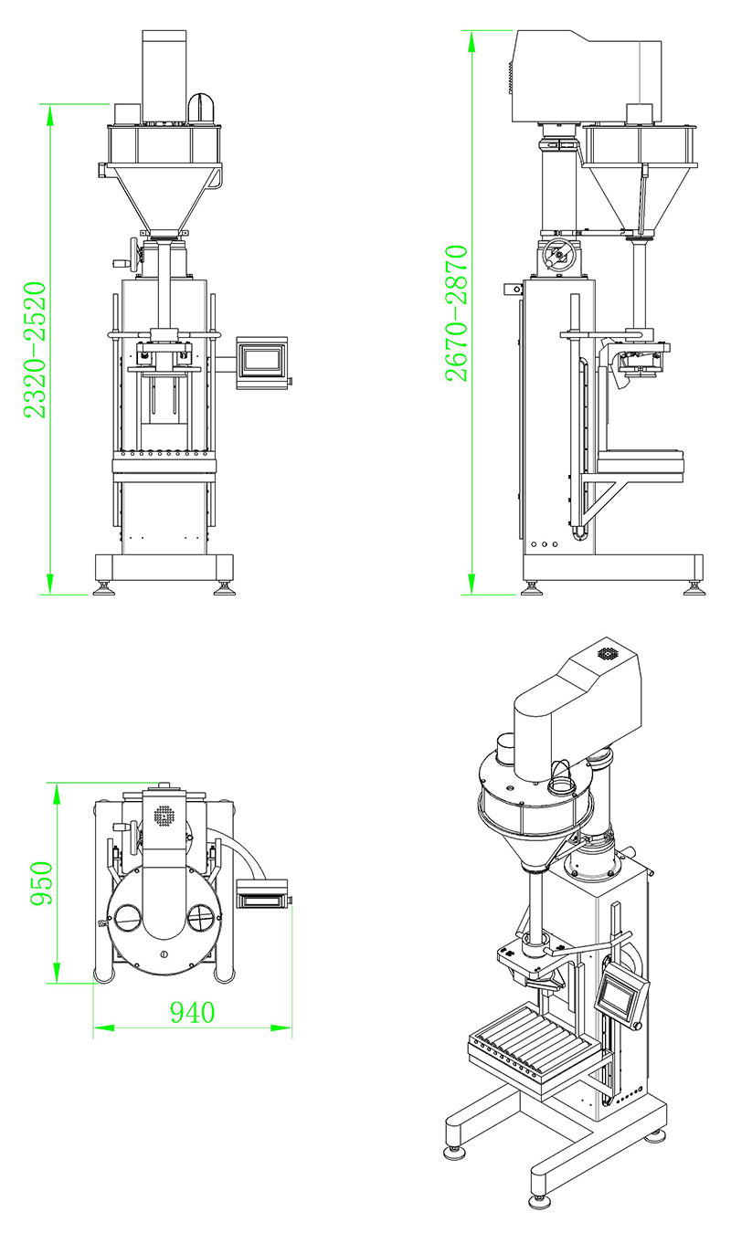 該機主要針對容易揚塵的超細粉末及高精度的包裝要求而開發設計,根據裝在容器下面的重量傳感器給出的信號完成雙速充填、計量及升降等工作,適用于包裝添加劑、碳粉、滅火器干粉、其它超細粉末、及有高精度包裝要求的粉末等。