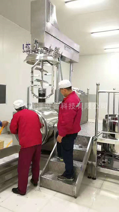 物料在水鍋、油鍋內通過加熱、攪拌進行混合反應后,由真空泵吸入乳化鍋,通過乳化鍋內上部的中心攪拌、聚四氟乙烯刮板始終迎合攪拌鍋形體,掃凈掛壁粘料,使被刮取的物料不斷產生新界面,再經(jīng)過葉片的剪斷、壓縮、折疊,使其攪拌、混合而向下流往鍋體下方的均質器處,物料再通過高速旋轉的切割輪與固定的切割套之間所產生的強力的剪斷、沖擊、亂流等過程,物料在剪切縫中被切割,迅速破碎成200um-0.2um的微粒,由于乳化鍋內處于真空狀態(tài),物料在攪拌過程中產生的氣泡被及時抽走。采用抽真空的方式,使所生產的制品在攪拌過程中不再混入氣泡,從而保證可制造出富有光澤、細膩及延展性良好的產品。